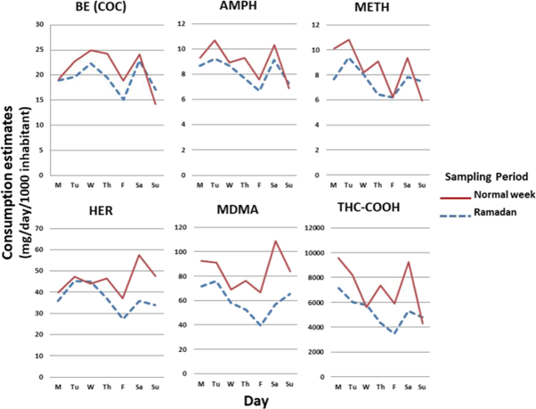 Drug use becomes more complicated when drugs are used for medical purposes. Research from Morocco on patient’s pharmaceutical drug use in treatment noted that the majority (58%) of surveyed individuals adjusted their drug intake to Ramadan; additional research from Kuwait highlighted that almost a fifth of surveyed patients would take all their medicine in a single intake before sunrise or straight after the first meal after sunset. A Turkish study analysing wastewater during Ramadan noted significant decreases in the detection of both legal and illegal drugs when compared to a normal week: MDMA, heroin, nicotine and alcohol were the drugs with the biggest declines.